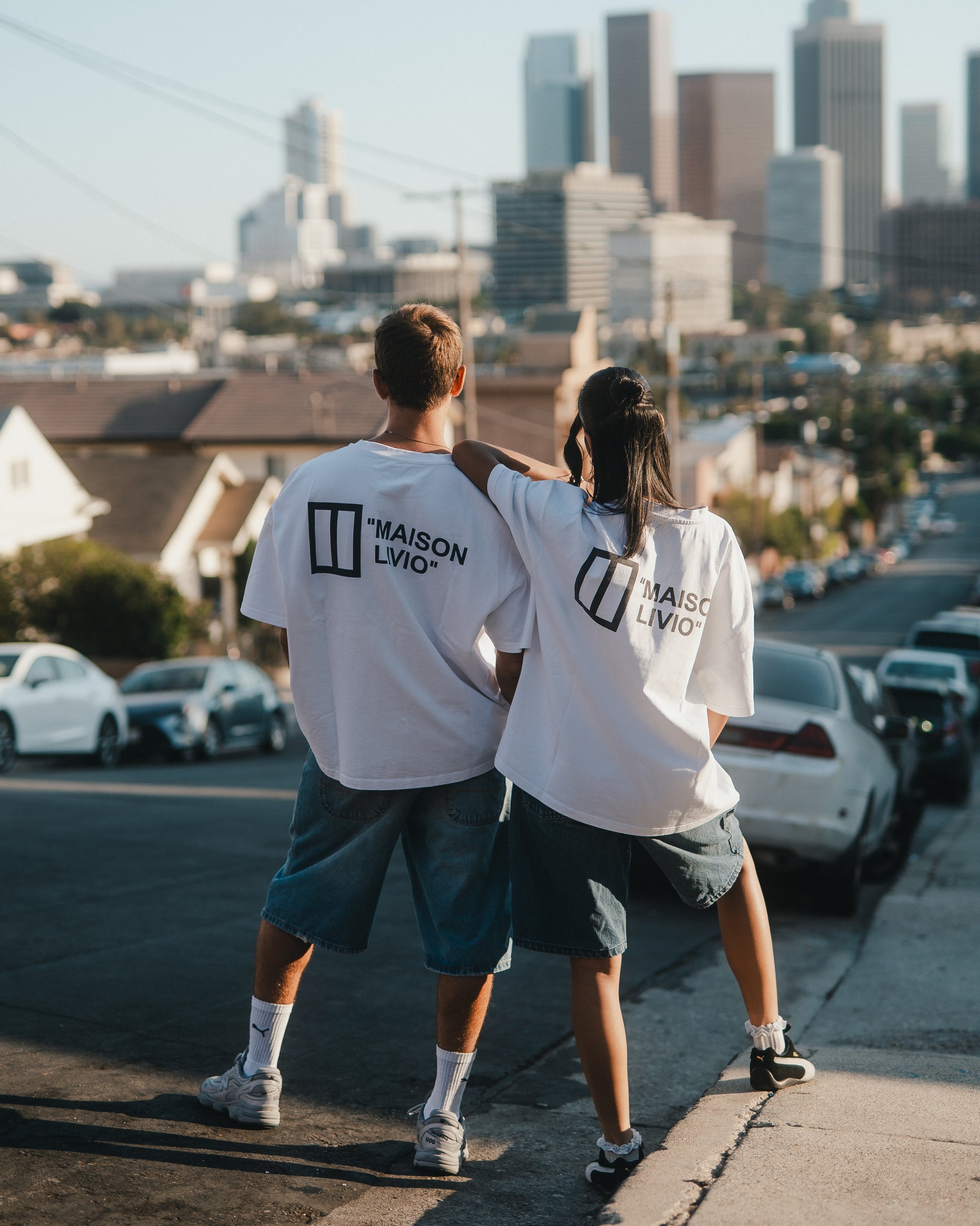 Il présente l’emblématique logo "Maison Livio" imprimé au dos. Inspiré par Tokyo, Los Angeles et Paris, ce modèle reflète une esthétique où l’art, la culture et la mode se rencontrent.